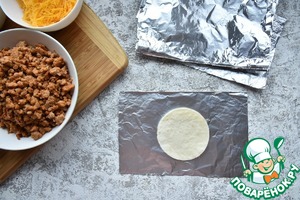 В центр мини тортильи помещаю по 1 ч. л. отварного риса, тушеного фарша, сальсы, тертого сыра.