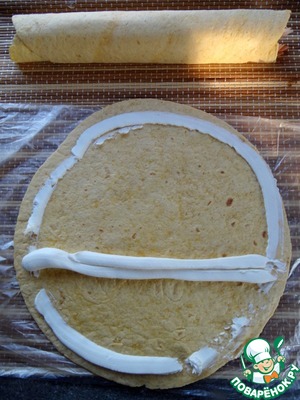Следует промазать лепёшку по кругу, чтобы она хорошо закрепилась при закручивании. -