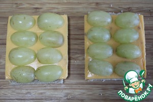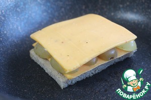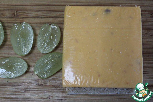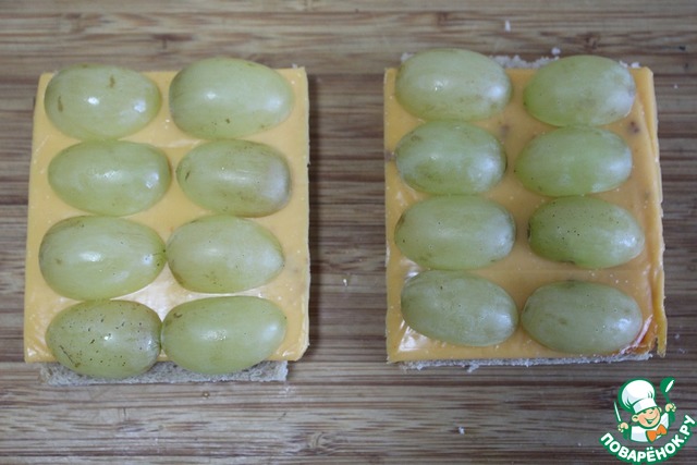 На хлеб выкладываем пластинку сыра, на нее виноград срезом вниз.