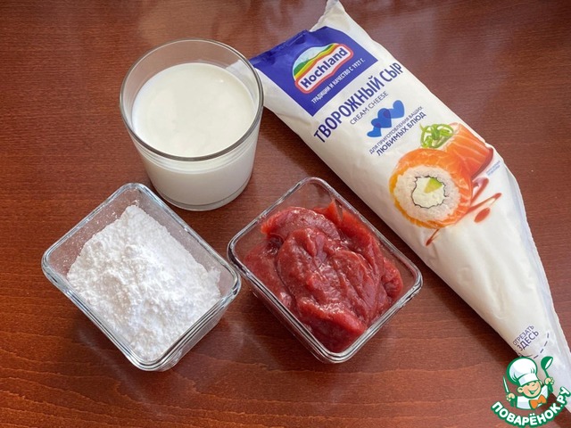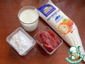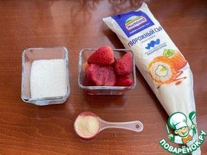 Пока остывает бисквит, приготовим клубничный крем- чиз. Для этого подготовьте все необходимые ингредиенты.