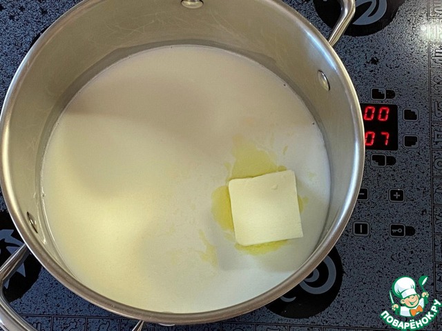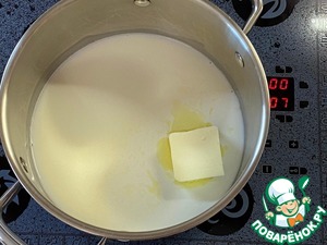 В сотейнике с толстым дном, подогрейте молоко и растопите сливочное масло, перемешайте.