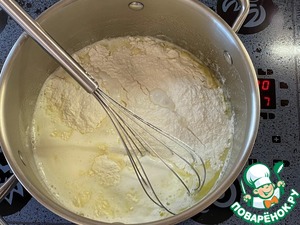 При постоянном помешивании, доведите тесто до загустения. Как только на дне сотейника появится " мучная" пленка- снимите с огня.
