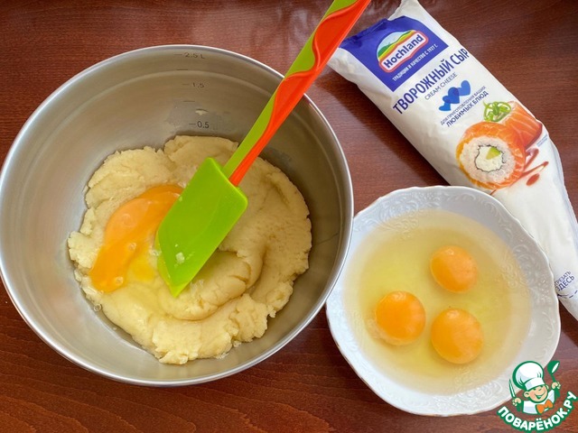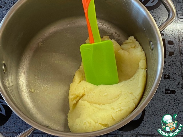 Тесто остудите в течении 5 минут и добавляя по-одному яйца, тщательно перемешивайте тесто лопаткой, до однородности.