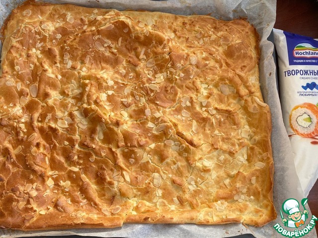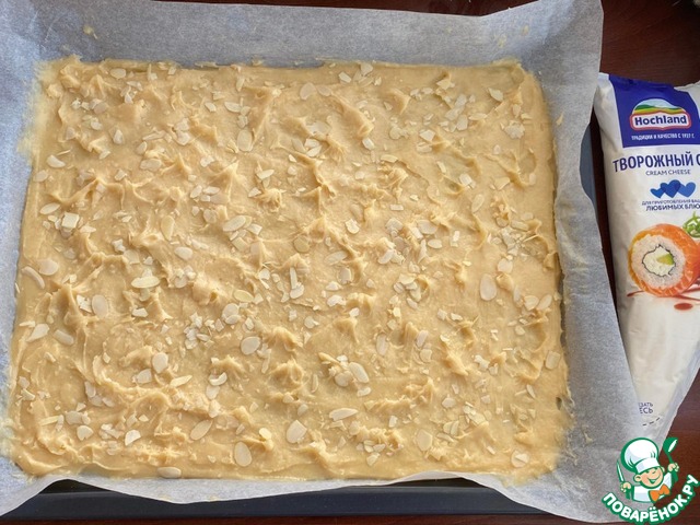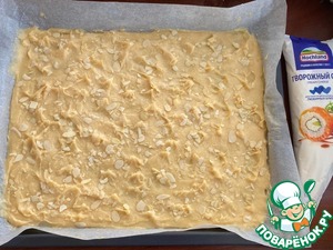 Тесто равномерно распределите по противню и при желании, посыпьте орешками или миндальными лепестками.