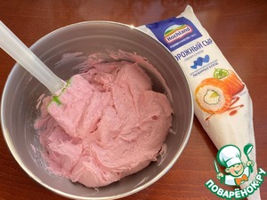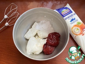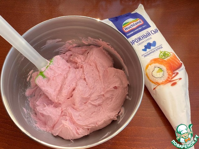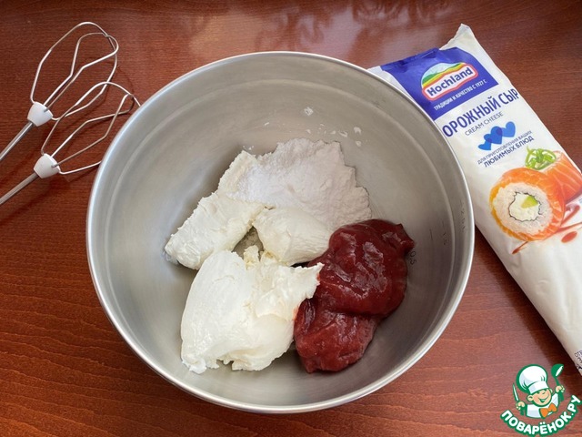 В миске смешайте творожный сыр ТМ "Хохланд", клубничное пюре и сахарную пудру.