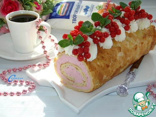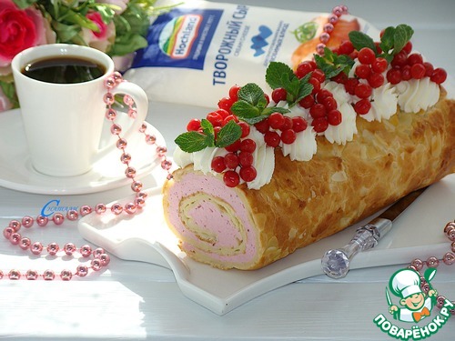 Этот рулет приготовлен по мотивам знаменитого торта "Карпатка". Нежный творожно- клубничный крем в сочетании с заварным бисквитом- отличный тандем для чаепития в выходной день или для вечерних посиделок.