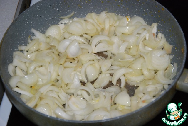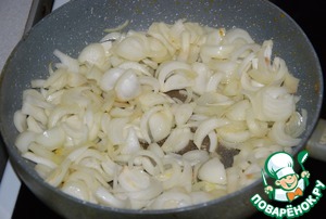 Подготовьте печень, помойте, удалите пленку, жилки и желчные протоки. Выложите нарезанный крупными полукольцами лук на раскаленную сковороду, смазанную растительным маслом.
