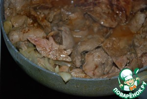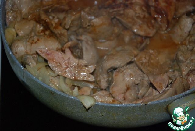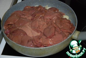 Как только лук слегка обжарится, выкладывайте к нему всю печень сразу. Для этого рецепта нам не нужна обжарка. Все достаточно потушить.