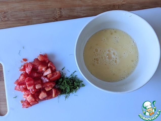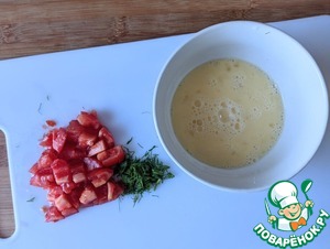 Готовим яичницу с помидорами. В миске взбиваем яйцо, солим. Помидор режем мелкими кубиками, зелень измельчаем, у меня - укроп. Смешиваем яйца с помидорами и зеленью.