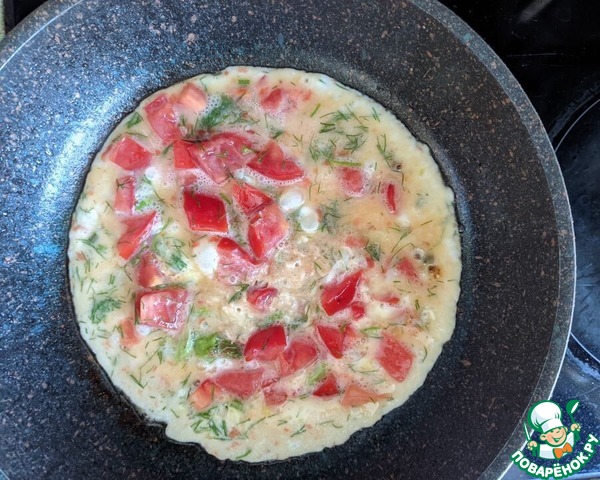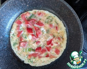 На горячую сковороду наливаем остатки масла. Выливаем яичную смесь, готовим на среднем огне до готовности, около 5 минут, под закрытой крышкой.