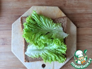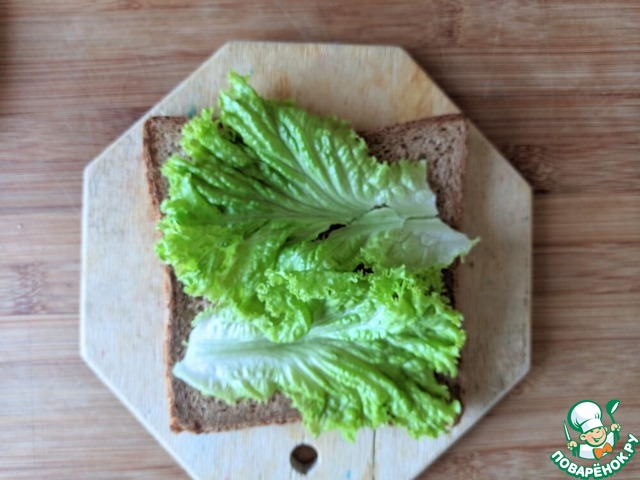 Собираем сэндвич. На тост кладём помытые, обсушенные листья салата.