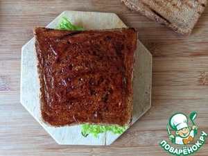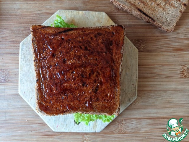 Второй подсушенный тост смазываем с обеих сторон соусом барбекю, кладём следующим слоем.