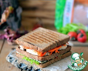 Сэндвич готов! Можно подавать. При употреблении, конечно, его необходимо разрезать. Приятного аппетита!