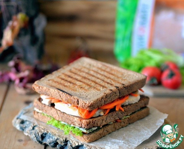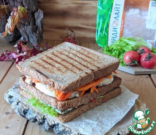 Пока радует октябрьская погода, отправляемся всей семьёй на пикник. А для перекуса предлагаю приготовить большой сэндвич с яичницей, помидорами, индейкой, соусом барбекю и морковью по-корейски. Такого сэндвича, конечно, не хватит на большую семью, но двоих накормит однозначно.