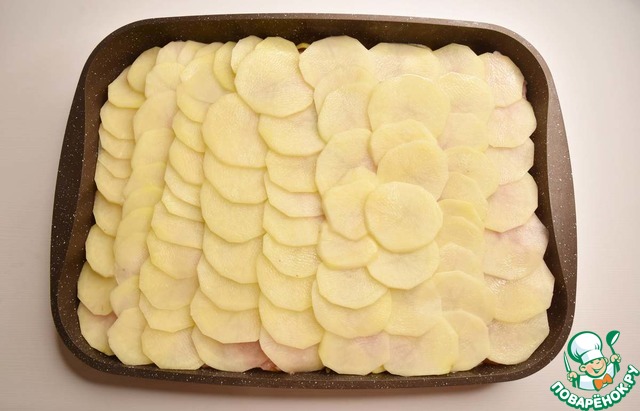 Перекладываю картофель с мясом и грибами в форму для запекания. Верх запеканки оформляю отложенными картофельными ломтиками.