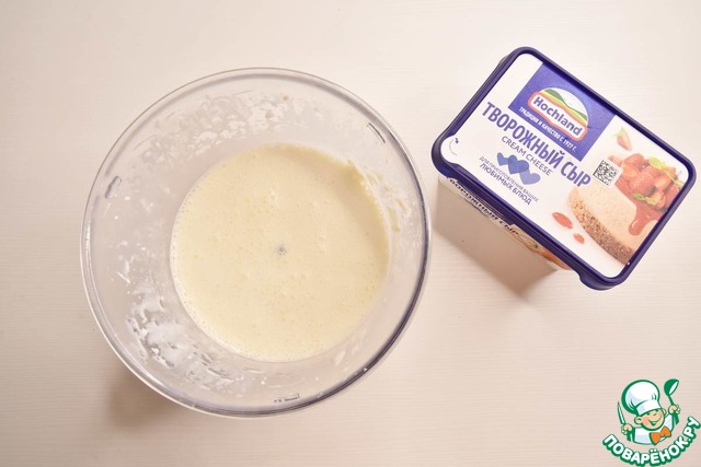 Для заливки смешиваю молоко с творожным сливочным сыром Hochland и вливаю смесь в форму.