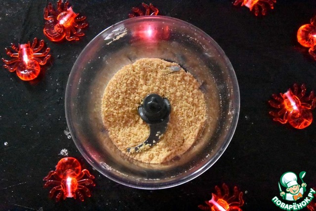 В блендере измельчаю в мелкую крошку сырные крекеры. Достаю сырную закску из холодильника, удаляю пленку и шпагат.