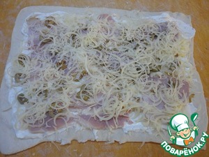 Сверху выложить тоненькие пластинки бекона и нарезанные кружочками оливки. Все присыпать сыром.