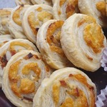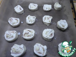 Рулет разрезать примерно на 14 кусочков, выложить на противень и запекать при 180-190С 20 минут.