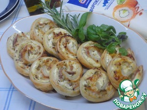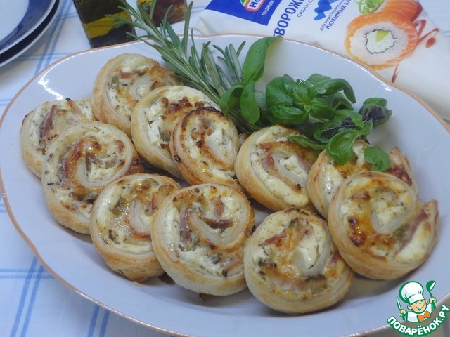 Пласт слоеного теста разморозить. Творожный сыр смешать со сметаной, травами и черным перцем.