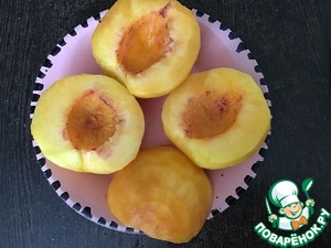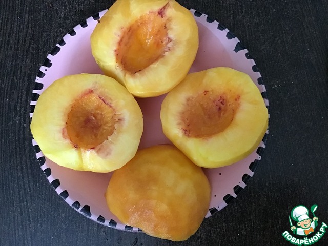 Персики очистить от кожуры, разрезать пополам и удалить косточки.