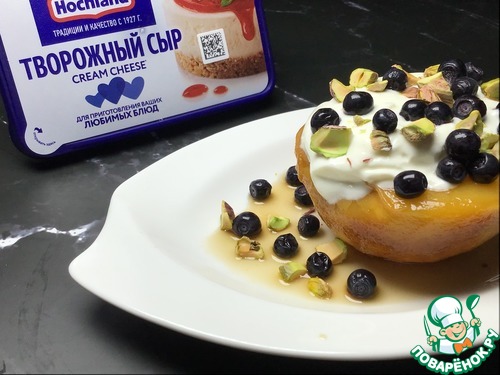 • Теплые персики выложить на порционные блюда, полить карамельным соком со сковороды, добавить крем, украсить черникой и фисташками.