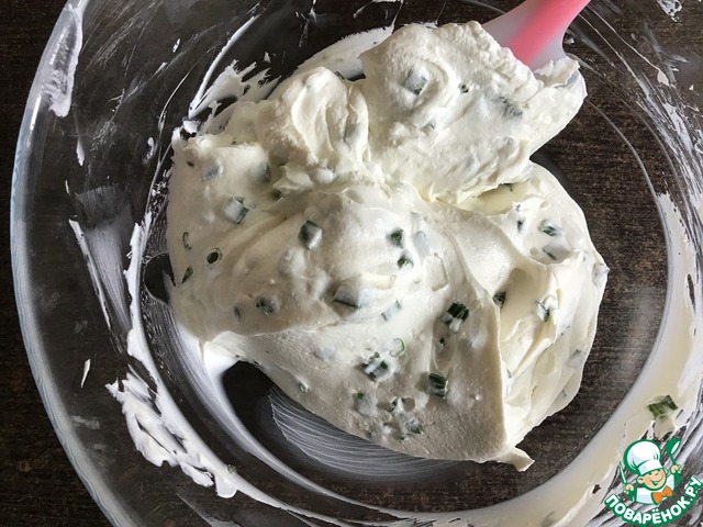 Творожный сыр (я использовала творожный сыр Сливочный от Hochland) хорошо размять, добавить соль по вкусу, зеленый лук. Хорошо перемешать. Начинка готова. Можно добавить брынзу, но в этом случае, количество соли в начинке необходимо уменьшить.