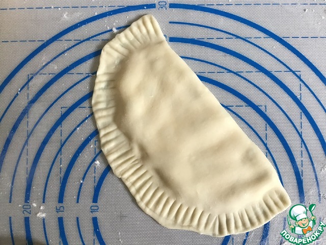 Накрыть начинку не смазанной стороной сочня, выпуская воздух, хорошо прижать края и дополнительно пройтись вилкой.