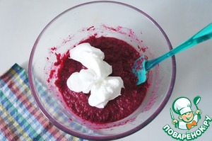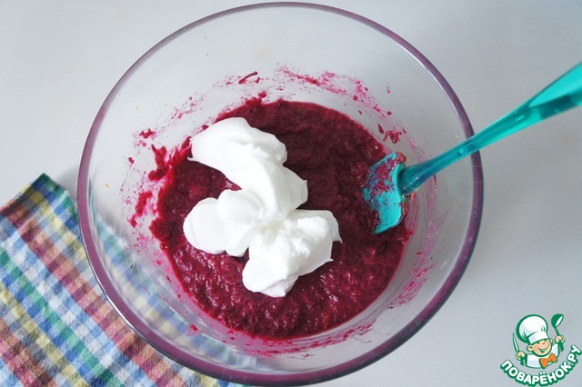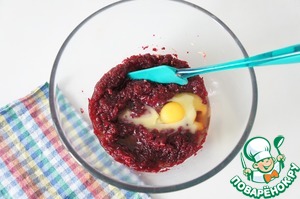 Свёклу натрите на мелкой тёрке или измельчите в комбайне. Если свёкла дала много влаги, слейте лишнюю. Сильно не отжимайте.