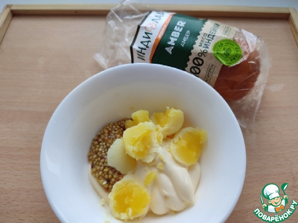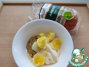 Из майонеза, лимонного сока, горчицы и желтков делаем заправку.
