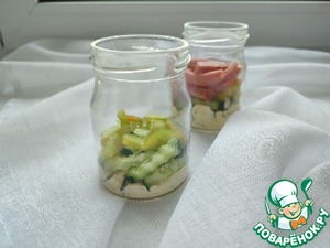 На дно банки кладём заправку и те состовляющие, которые могут дать сок - огурец и перец.