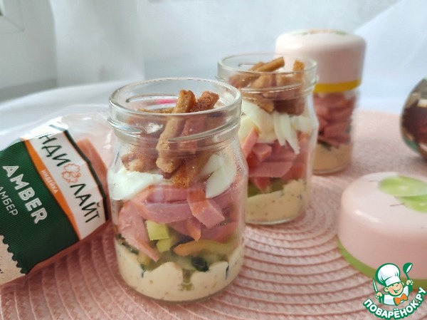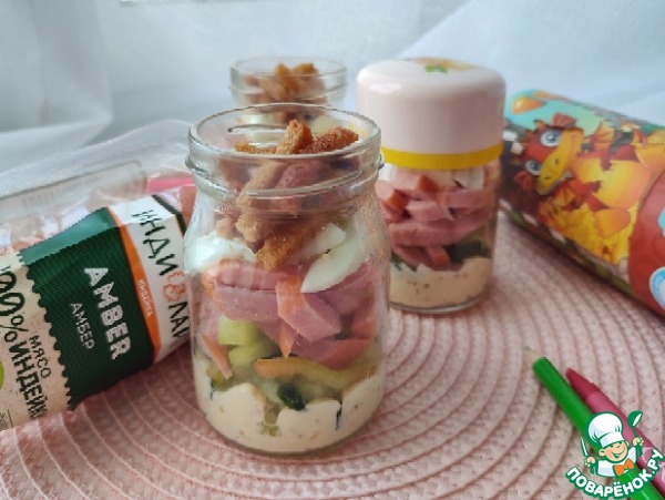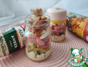 Почему "Студенческий"? Потому что колбаса и сухарики, мне кажется, являются одним из главных атрибутов студенческого перекуса))) Салат в банке - это удобно, сытно и вкусно. Но и классический вариант подачи порадует вас и вашу семью.