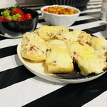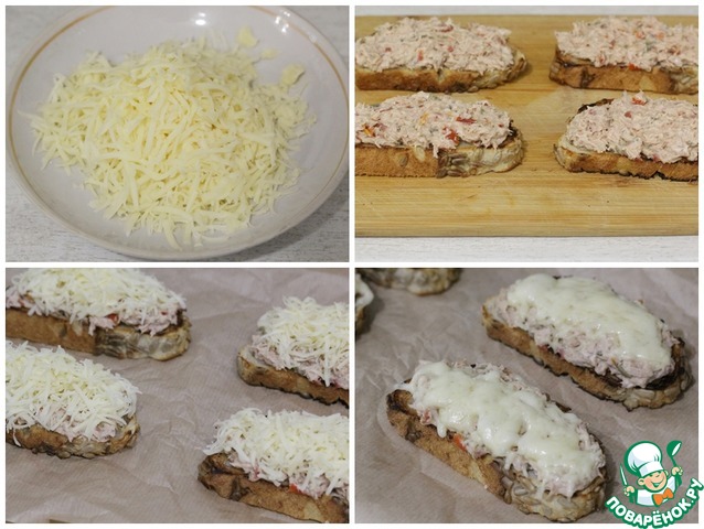 На подсушенную чабатту выложить начинку, посыпать тёртым сыром.