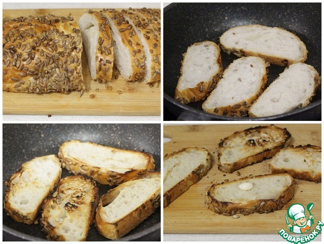 Чабатту нарезать на ломтики и подсушить (а не передержать, как я) на сухой сковороде, затем слегка натереть разрезанным зубчиком чеснока.