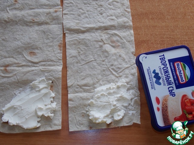 На угол лаваша выложить по 1 столовой ложке творожного сыра. Я использовала сыр Т. М. Хохланд.