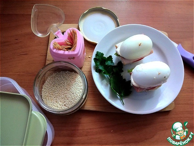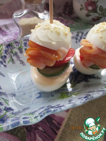 Накрываем верх. Сразу говорю, что "конструкция" устойчивая, но для большей устойчивости проткните шпажками или зубочистками. Немного верхушку яйца примажем майонезом и посыпим кунжутом.
