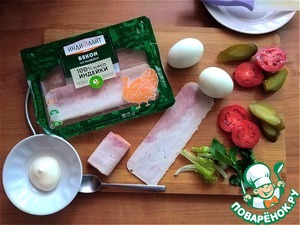 Готовим все продукты. Для закуски яйца нужно сварить вкрутую. Можно это сделать заранее. Бекон из индейки можно обжарить, что и написано у него на упаковке. Для себя я жарить не буду. Сворачиваем ломтик нарезанного бекона вчетверо - по величине разрезанного пополам яйца. Огурец нарезаем пластинами наискосок, а помидор - кругляшами. Для яиц нужно брать мелкие и помидоры, и огурцы, и листики салата.