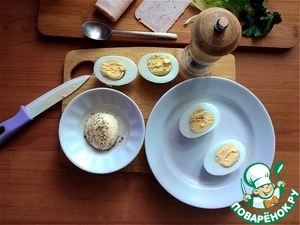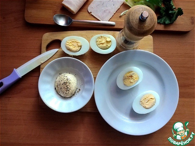 Чтобы яйца, лёжа на боку, были устойчивые их тёплыми нужно почистить и уложить на бок, немного прижав или срезав чуть у бочкА белок. Разрезаем яйца на 2 части (см. фото). Майонез я немного поперчу чёрным свежемолотым перцем.