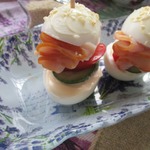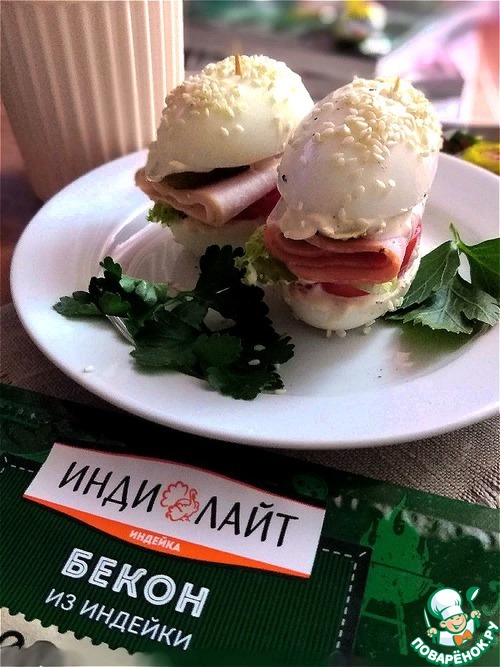 Собираем сэндвичи. Верх нижней половинки яйца обмазываем майонезом. На него укладываем кружок помидора, потом - мелкую зелень (листья салата и петрушки), далее - свёрнутый бекон, на бекон - дольку огурца. Обмазываем верхнюю половинку яйца тоже майонезом с перцем.