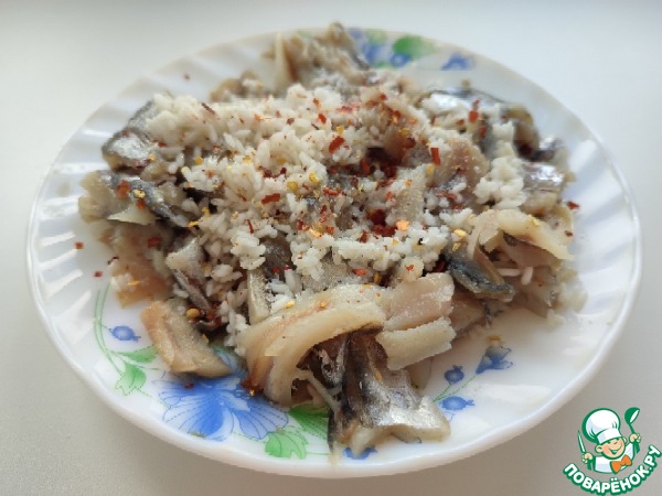 Рыбу нарезаем крупными кусками, смешиваем с рисом (воду предварительно сливаем). Солим и перчим.