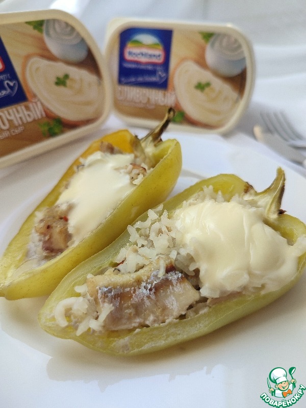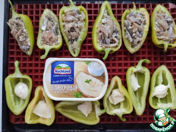 В каждую половинку перца выкладываем ложку сливочного сыра, заполняем начинкой.