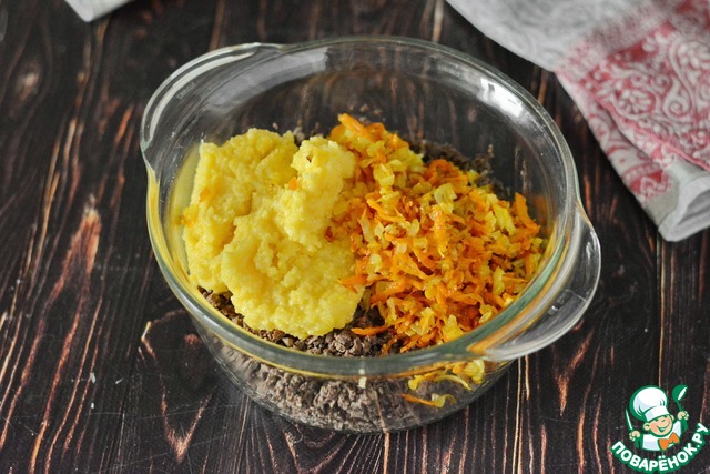 Соедините в миске измельчённое лёгкое, готовую поленту и пассерованные овощи. -