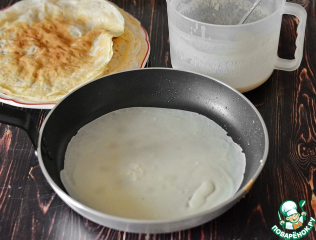 Смазывая разогретую сковороду маслом выпекайте тонкие блинчики с двух сторон до лёгкого румяного цвета. -