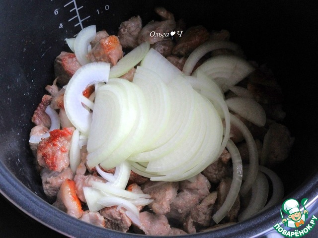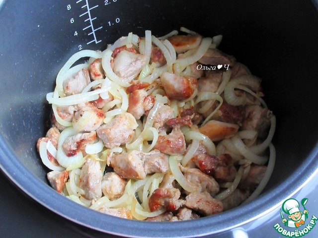 Филе свинины нарежьте небольшими кусочками, обжарьте без масла в режиме "Жарка" до румяности. Добавьте нарезанный полукольцами лук.