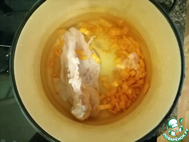 Кость от куриной грудки и нарезанную морковь заливаем водой и ставим варить на 30 минут.