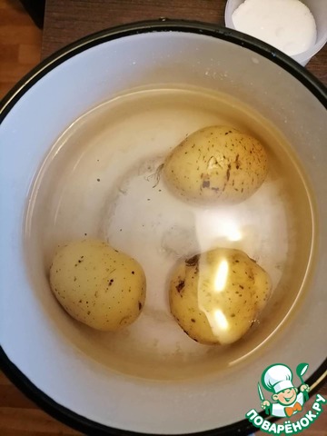 Половину картофеля моем, заливаем водой и варим в мундире 25 минут, затем слегка охлаждаем.