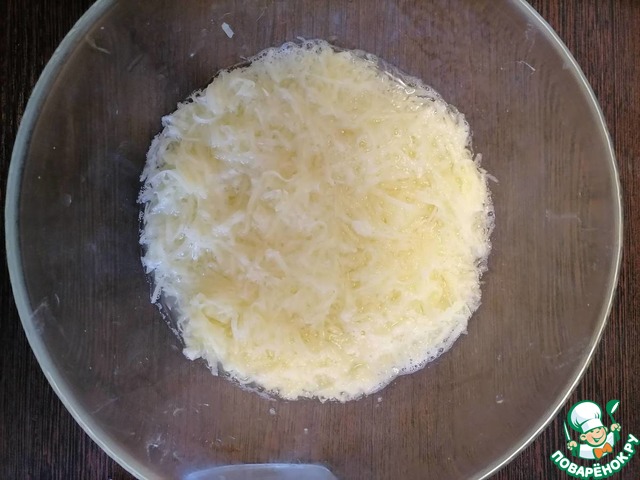Оставшийся сырой картофель очищаем, трем на мелкой терке. Заливаем водой, чтобы вывести лишний крахмал.
