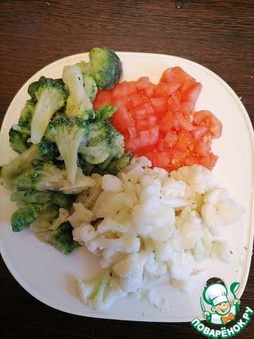 Нарезаем овощи - помидор (кожицу предварительно снимаем), брокколи и цветную капусту. Закидываем овощи в готовый бульон. После закипания варим овощи 10 минут.