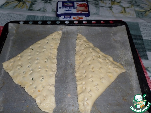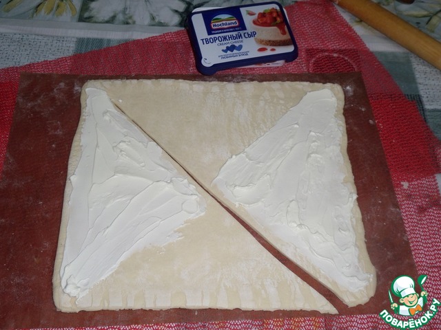 На каждый треугольник теста выкладываем по 1 ч. л. с горкой творожного сыра и равномерно распределяем на половине треугольника. -