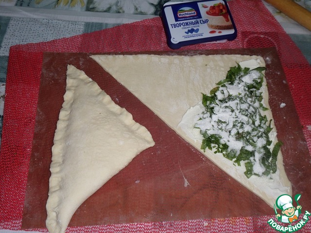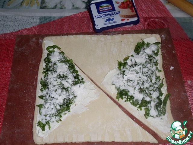 Каждый пласт слоеного теста раскатываем на рабочей поверхности и разрезаем на 2 треугольника.